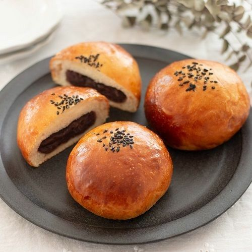 Anpan is a soft, round bun filled with sweet red bean paste (anko). It’s distinguished by a caramel-coloured bun topped with black sesame seeds.